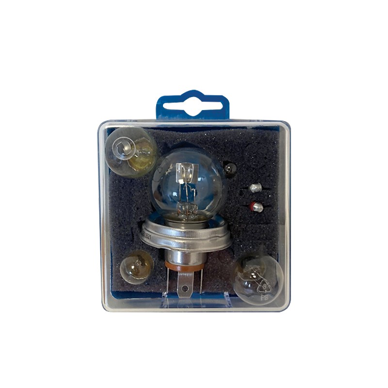 Caja que incluye: 1 bombilla código europeo 40/45W - 1 bombilla 21W - 1 bombilla 21/5 W - 1 bombilla W5W - 2 fusibles americanos 10a y 15A.