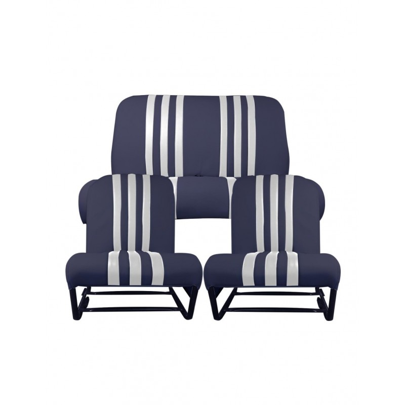 Este kit consta de 2 molduras de asiento delantero asimétrico y 1 moldura de banco trasero. Las molduras están equipadas con solapas laterales. Color Azul rayado Blanco. Le aconsejamos que compruebe el estado de la espuma y de los fondos de los asientos, así como de los anillos de goma. Producto complementario Referencia 1355A. Se monta en 2cv6, Dyane 6.